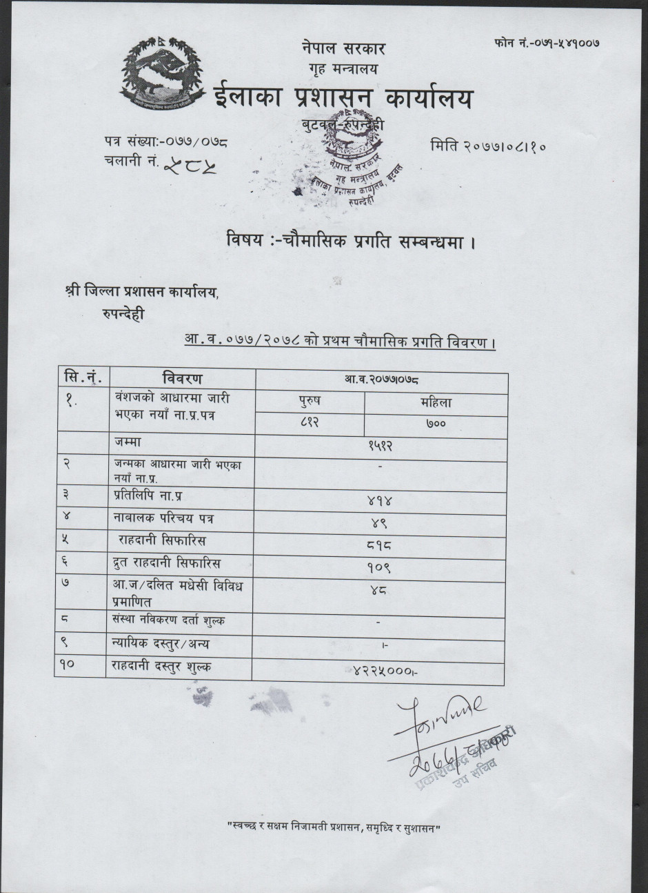 ईलाका प्रशासन कार्यालय बुटवलको मासिक चौमासिक विवरण सम्बन्धमा ।
