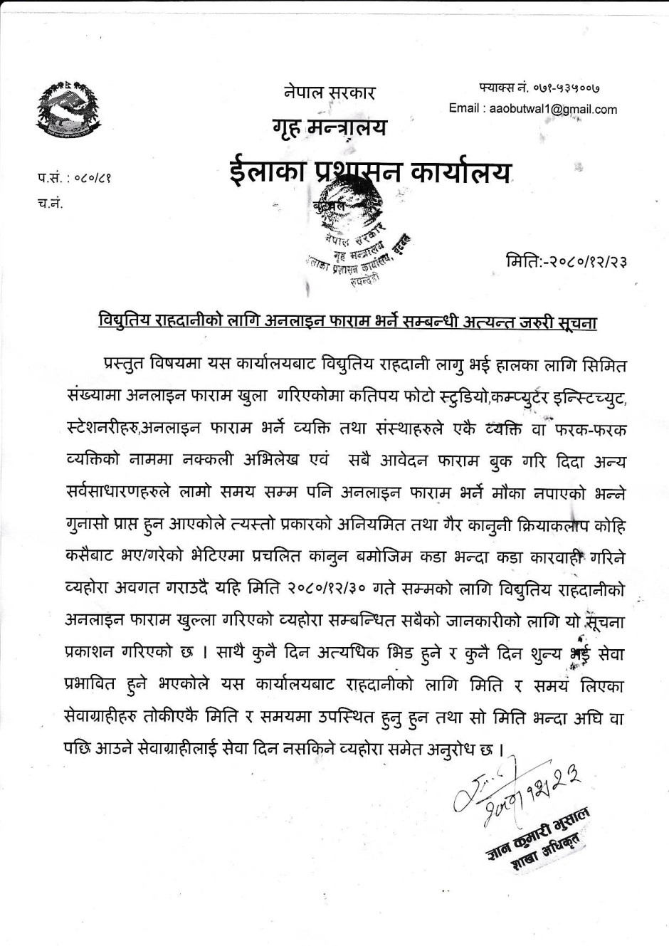 राहदानीको सम्बन्धी सुचना।