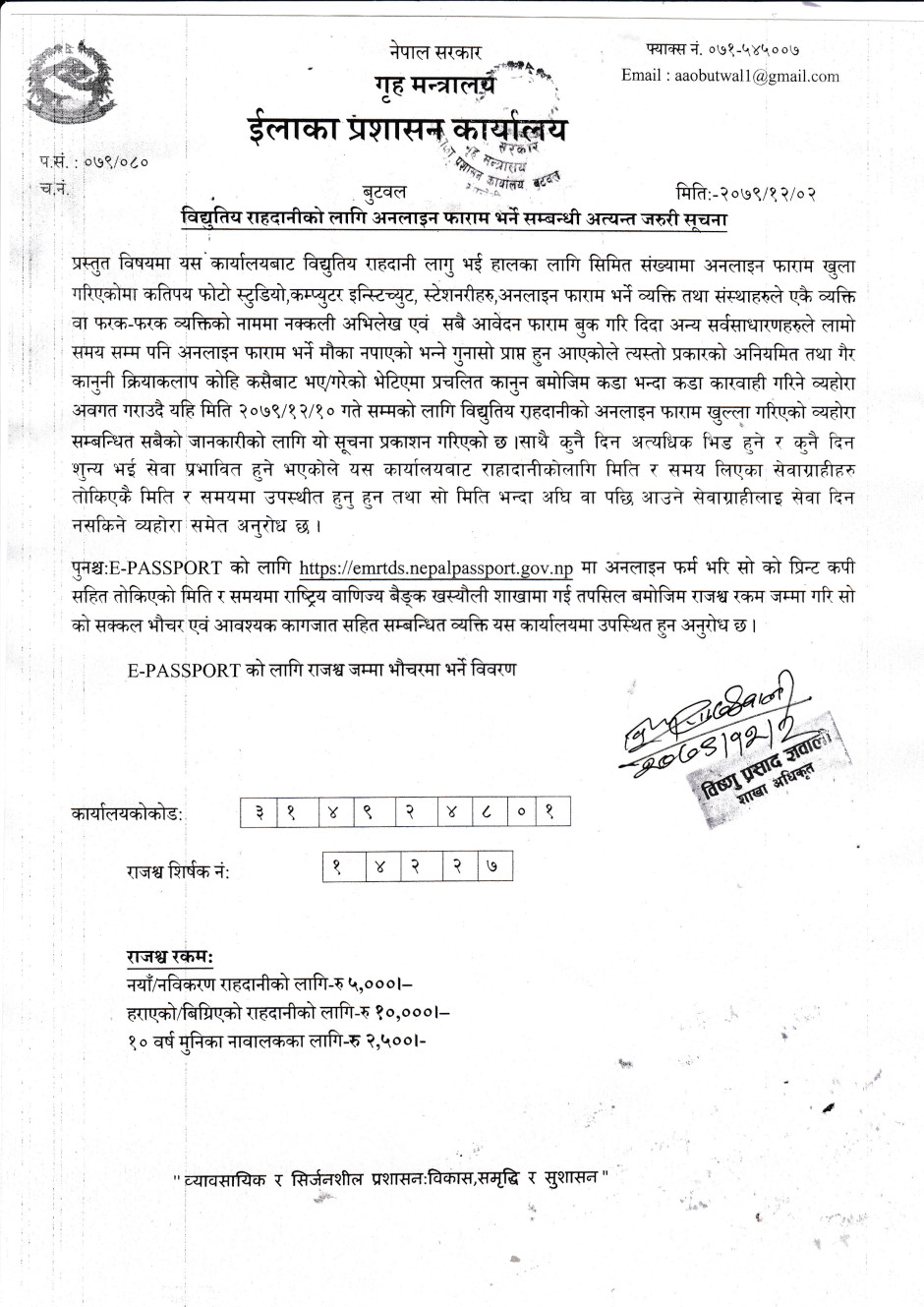 राहदानीको सेवा सुचारु सम्बन्धी सुचना ।