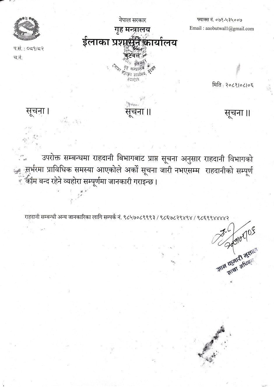 राहदानीको सेवा सुचारु सम्बन्धी सुचना ।