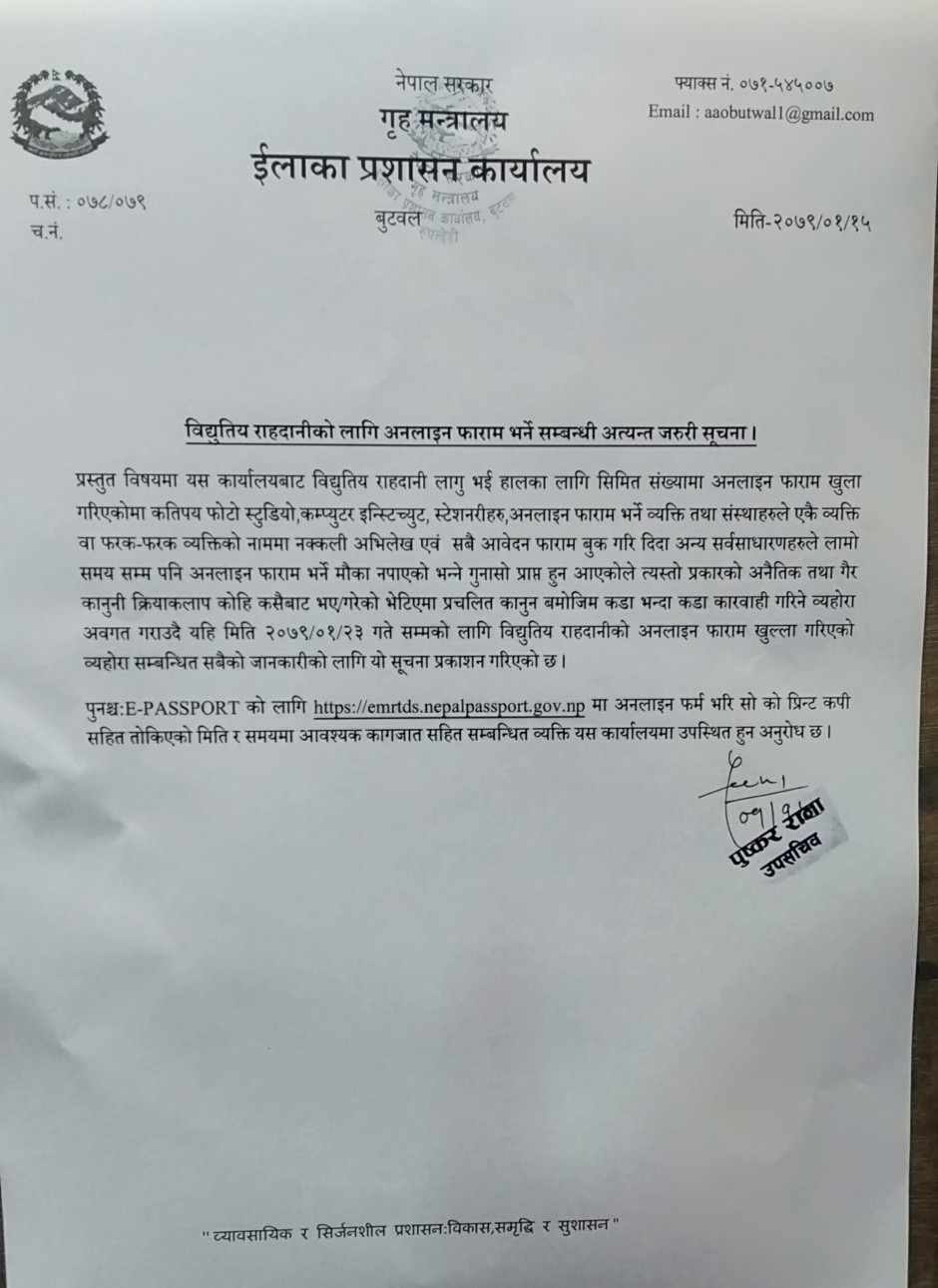 राहदानीको सेवा सुचारु सम्बन्धी सुचना ।