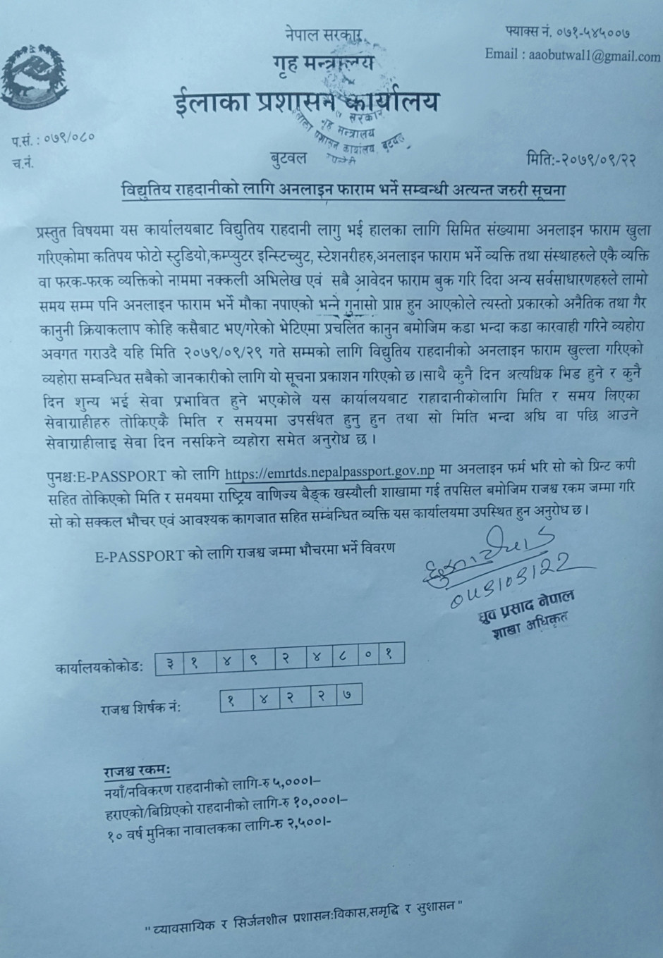 राहदानीको सेवा सम्बन्धी सुचना ।