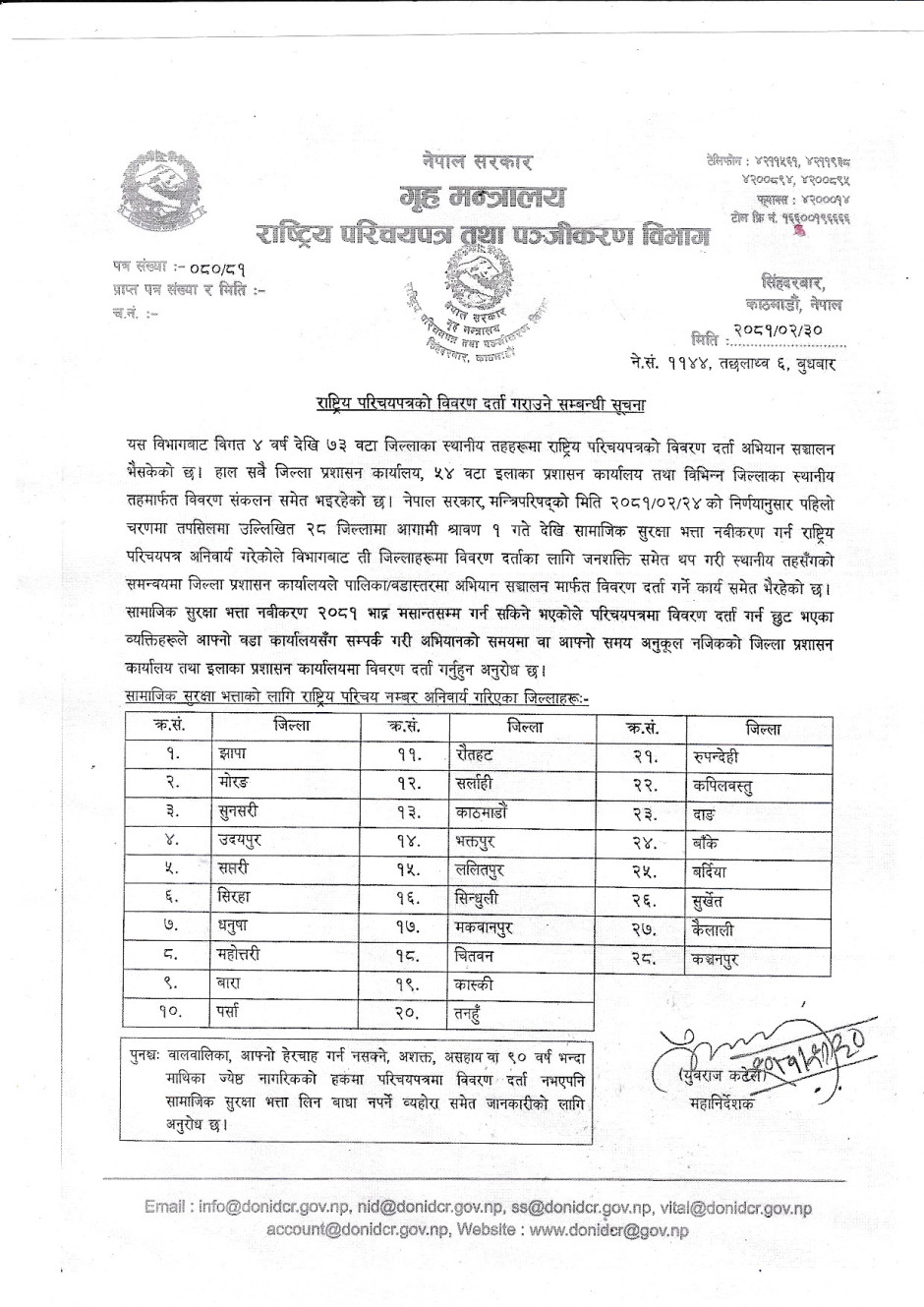 राष्ट्रिय परिचपत्रको सेवा सूचारु सम्बन्धी सुचना ।