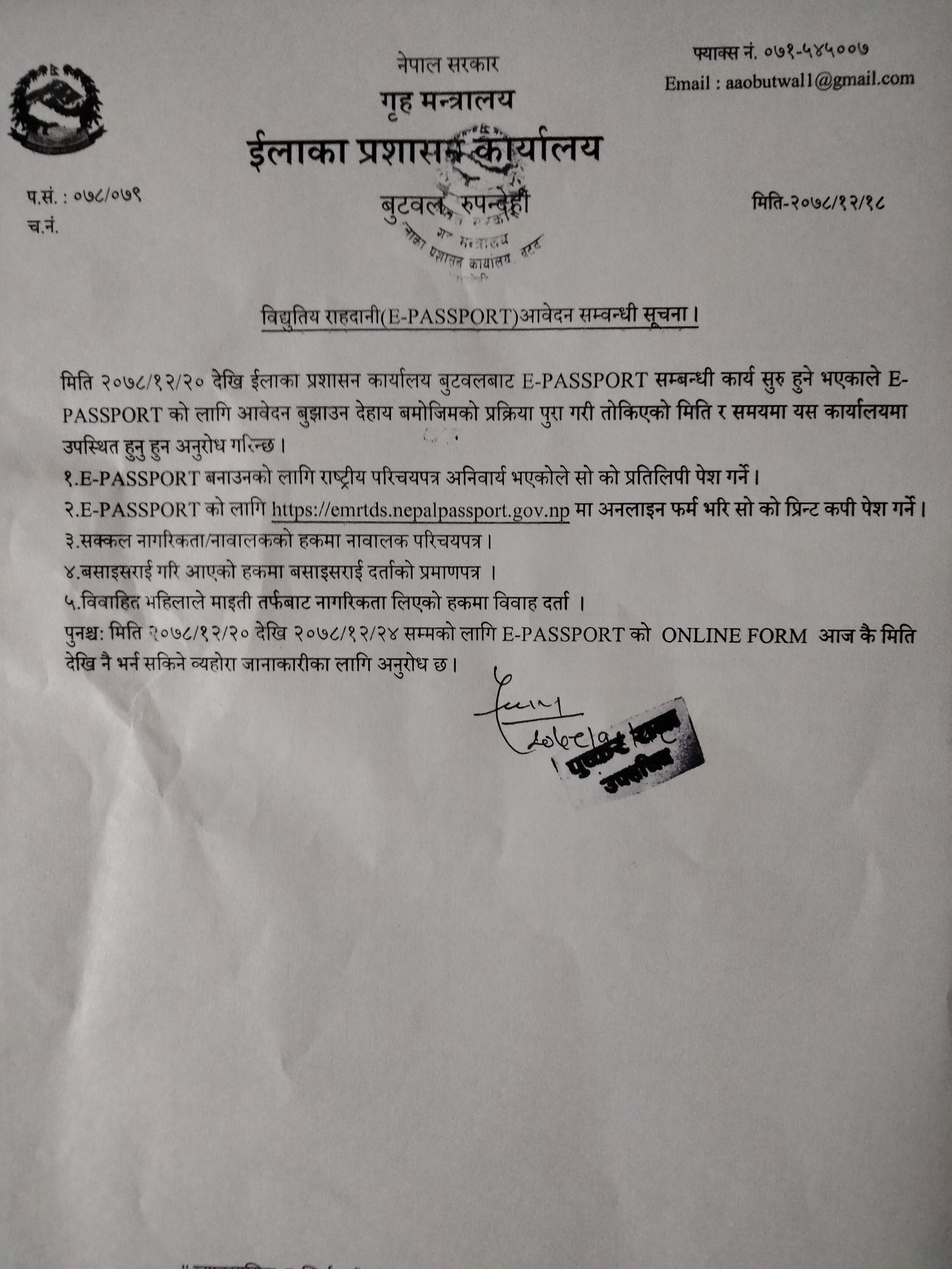 राहदानीको सेवा सम्बन्धी सुचना ।